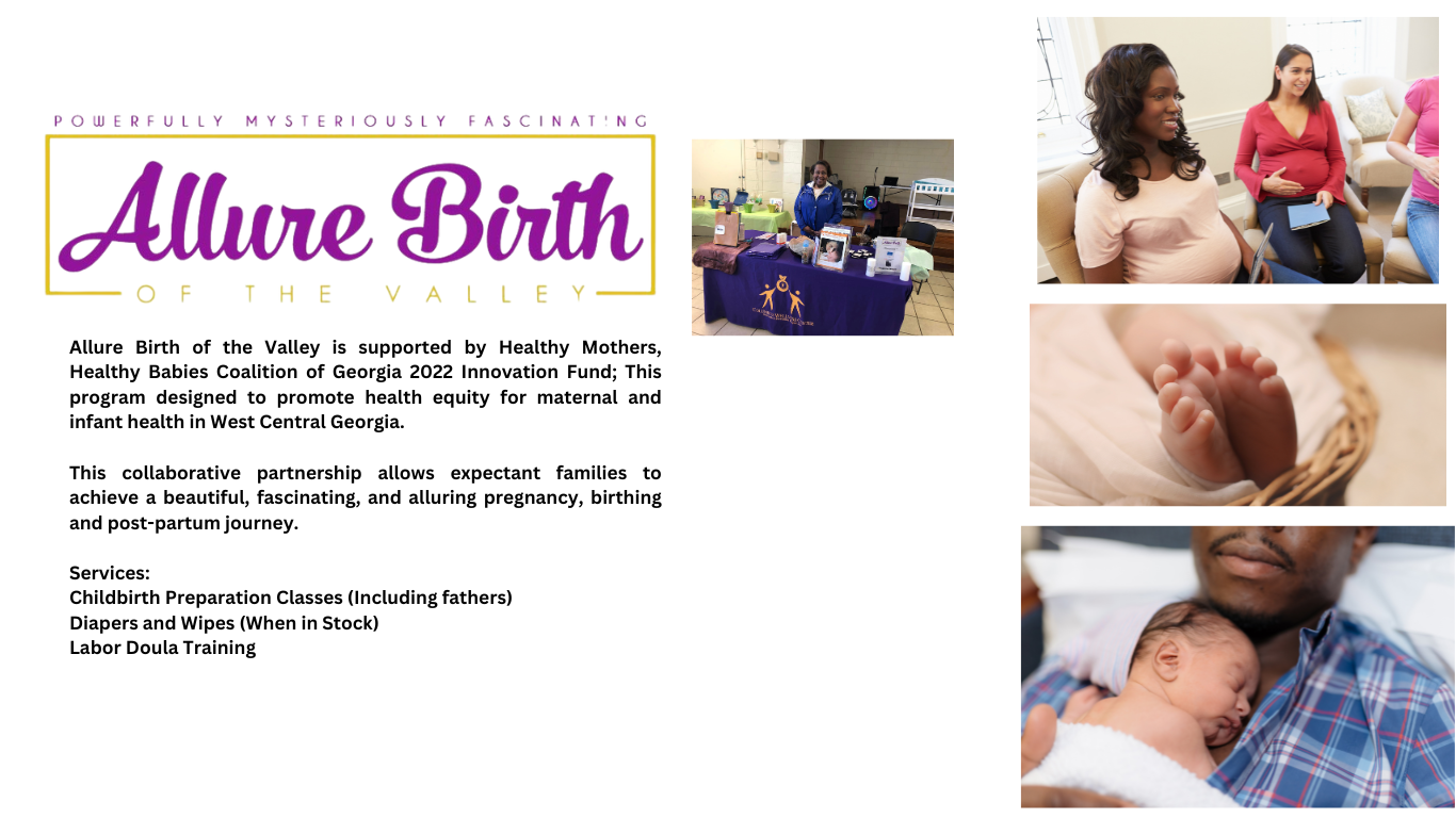 Allure Birth Concierge is designed with dedicated innovators serving the Chattahoochee Valley area. This collaborative program is committed to providing services and the immediate needs of expectant parents and new parents to include support, supplies when available, evidence based childbirth preparation education, and Labor Doula services including recruitment and training.